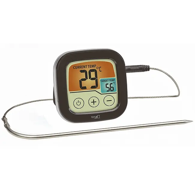 Виробник: TFA Dostmann GmbH & Co.KG, GermanyОсобливості:Універсальний кухонний щуп-термометр, що ідеально підходить для приготування м'яса і птиці шляхом контролю температури всередині продуктуМоже використовуватися для духовки або гриля, а також для приготування їжі при низьких температурахІндивідуальні температурні вимоги можуть бути запрограмованіСигнал тривоги при досягненні заданої температуриКольоровий дисплейПідсвічуванняСенсорні кнопкиЩуп з нержавіючої сталі з кабелем довжиною біля 1 мЗ монтажним магнітом і настільною підставкою (розкладний)Зареєстрований дизайн TFAДізнайтеся, як приготувати ідеально печеню, стейк та інші страви: стежте за температурою всередині продукту приготування! Гігієнічний щуповой датчик з нержавіючої сталі може залишатися в духовці або грилі протягом всього процесу приготування. Просто вставте щуп в шматок м'яса і виведіть кабель з духовки. Помістіть пристрій поряд з духовкою за допомогою підставки або прикріпіть його за допомогою магніту - тепер ви можете в будь-який момент прочитати температуру всередині м'яса на кольоровому дисплеї. Ідеально для приготування при низькій температурі. Цей універсальний пристрій може також використовуватися для інших цілей в приготуванні їжі, таких як контроль температури дитячого харчування.