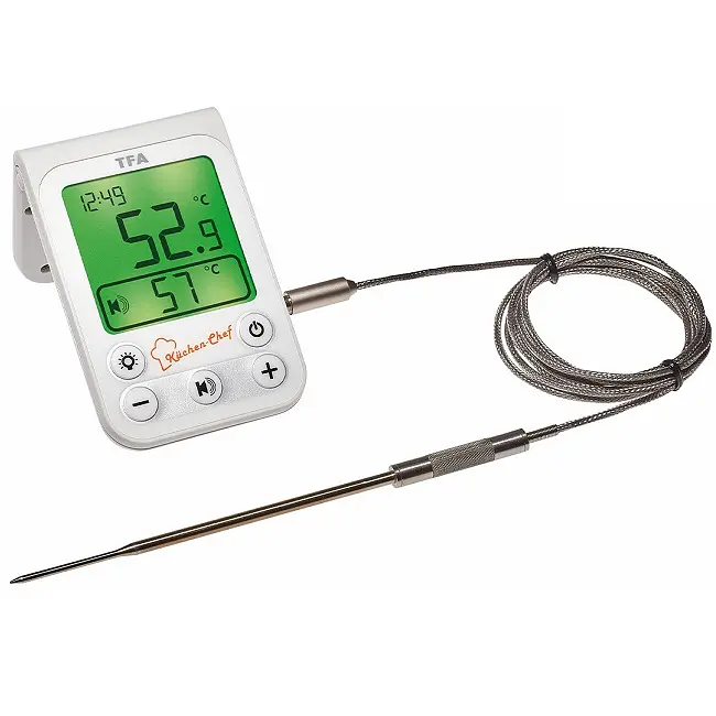 Виробник: TFA Dostmann GmbH & Co.KG, GermanyОсобливості:Універсальний кухонний щуповий термометр, що ідеально підходить для досконалого приготування м'яса і птиці шляхом контролю температури всередині продуктуМоже використовуватися в духовці або барбекю, а також для приготування їжі при низьких температурахОптичні і акустичні сигнали при досягненні заданої температуриГодинникПідсвічуванняМембранні кнопки для простоти експлуатації та очищенняЩуп з високоякісної нержавіючої сталі з дуже тонким наконечником і шорсткою ручкою для надійного захоплення, вставне з'єднання з анодованого алюмінію, біля 1,2 м кабель із захистом від вигинуЗ монтажним магнітом і підставкоюЗареєстрований дизайн TFAОбсмажування і приготування м'яса на грилі до досконалості - завдяки контролю температури всередині м'яса!Готуйте як професіонал зі 100% гарантією успіху. Це пов'язано з тим, що цифровий термометр для смаження на грилі «KÜCHEN-CHEF» надійно інформує вас, коли досягається бажана температура всередині продукту. Це гарантує, що у вас завжди буде ідеальна ступінь готовності - віддаєте перевагу ви недосмаженому м'ясу, середньо або добре просмаженому.Високоякісний щуповий датчик з нержавіючої сталі може залишатися в духовці або грилі протягом всього процесу приготування. Просто вставте щуп в м'ясо і виведіть термостійкий кабель з духовки. Надтонкий наконечник щупа забезпечує швидке вимірювання і захищає структуру м'яса.Помістіть або повісьте пристрій поряд з духовкою. Термометр простий у використанні і легко читається завдяки дисплею з яскравим підсвічуванням. «KÜCHEN-CHEF» ідеально підходить навіть для приготування їжі при низьких температурах.ЦеЙ універсальний пристрій також може бути використано для інших цілей в приготуванні їжі, наприклад, для контролю температури дитячого харчування, приготування джему або шоколадної маси.