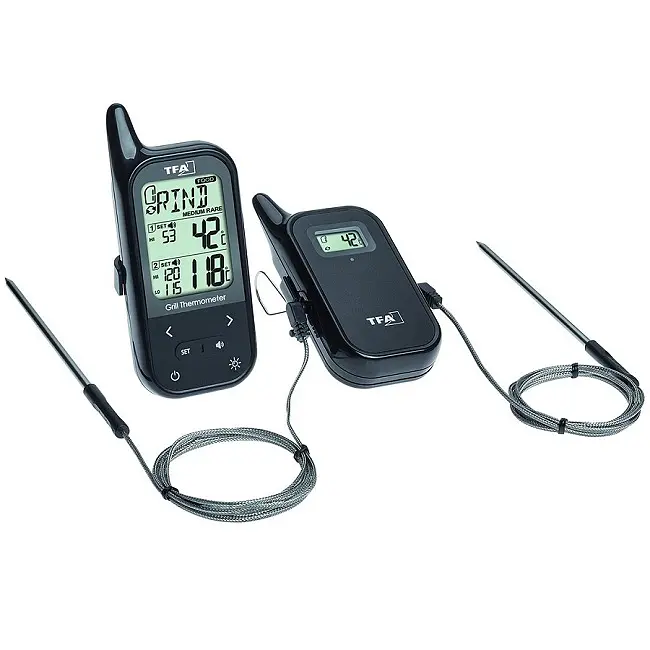 Виробник: TFA Dostmann GmbH & Co.KG, GermanyОсобливості:Для ідеального приготування м'яса, птиці та риби, можна використовувати для духовки або барбекю Виносний датчик з двома щупами з нержавіючої сталі з кабелем (близько 100 см), дальність дії до 100 м (на відкритому просторі)В якості альтернативи два щупи можуть використовуватися для контролю температури в камері барбекю або духовки - з верхньою і нижньою межами температури або внутрішньою температурою максимум двох барбекю шматків м'ясаТакож ідеально підходить для контролю приготування при низьких температурахПопередньо запрограмовані налаштування для різних видів м'яса і ступеню готовності (німецькою і англійською мовами): • Яловичина, телятина, баранина, свинина, курка, індичка, риба і гамбургер • Добре просмажене, середнє, середньо-просмажене і недосмаженеМожливість програмування індивідуальних заданих температурАварійний сигнал, коли досягається внутрішня температура, і якщо температура в духовці виходить за встановлені межіПідсвічуванняЗ фіксаторами щупівЗареєстрований дизайн TFAМ'ясо та птиця приготовлені до досконалості! Готуйте як професіонал зі 100%-ним успіхом. Особливість: KITCHEN CHEF TWIN має два сенсорних щупа з нержавіючої сталі. Це дозволяє контролювати температуру камери для приготування барбекю і м'яса для барбекю, а також верхній і нижній межі температури в кухонній духовці. Ви також можете контролювати внутрішню температуру максимум двох шматків жаркого або двох шматків м'яса BBQ одночасно. І вам навіть не потрібно знаходитися на кухні - виміряні значення передаються за допомогою бездротової передачі від виносного датчика на основний блок. Таким чином, ви можете ефективно використовувати час, щоб привітати своїх гостей, розслабитися і випити - поки м'ясо все ще перебуває в духовці або лежить на грилі для барбекю. Ви будете повідомлені звуковим сигналом, коли буде досягнута бажана внутрішня температура або температура духовки вийде за межі запрограмованих меж.