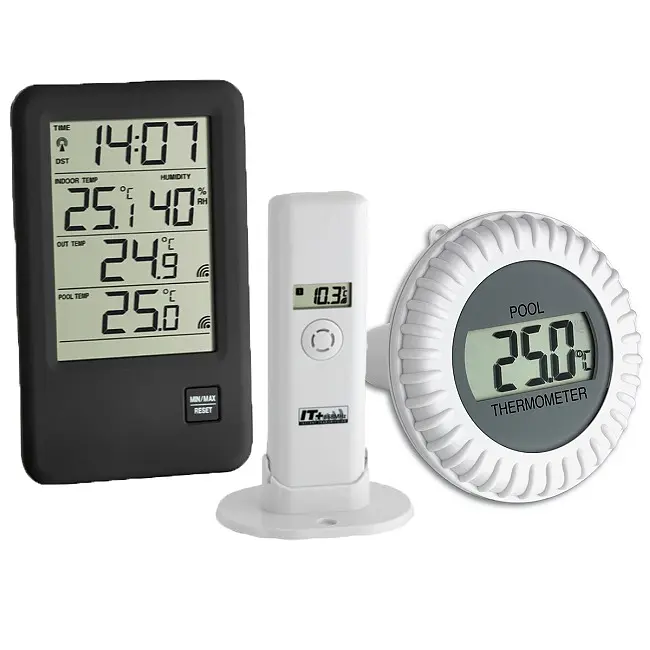 Виробник: TFA Dostmann GmbH & Co.KG, GermanyОсобливості:Пристрій призначений для басейну і штучного водоймищаТемпература води (глибина вимірювання 100 мм) передається від бездротового зовнішнього датчика на частоті 868 МГц, відстань передачі до 100 метрів на відкритому просторі або до 25 метрів у водіЗовнішня температура повітря передається від бездротового зовнішнього датчика на частоті 868МГц, відстань передачі до 100 метрів на відкритому просторіІндикація кімнатної температури і вологостіМаксимальні і мінімальні значенняТемпература конденсаціїРадіокерований годинник з високою точністю і можливістю ручного налаштуванняНалаштування часового поясу -2 / + 5 годинДуже просте налаштуванняВеликий РК-дисплей (115 мм по діагоналі), який добре читаєтьсяКорпус зовнішніх датчиків з РК-дисплеємЗареєстрований дизайн TFAНаважитеся ви стрибати в холодну воду або просто опускаєте великий палець у воду? Чи є у водних рослин і риб правильні умови життя? За допомогою сучасного бездротового термометра "MALIBU" ви можете контролювати температуру води у вашому басейні чи ставку - і все це, не виходячи з вітальні. Плаваючий термометр-датчик передає інформацію безпосередньо по бездротовому зв'язку на базову станцію, а також має власний дисплей температури. Датчик має глибину вимірювання 100 мм. Це дає вам особливо надійні значення. «MALIBU» надає додаткову корисну інформацію. Зовнішня температура передається через передавач на відстань до 100 м, внутрішні датчики вимірюють клімат в приміщенні, а радіокерований годинник показує точний час.
