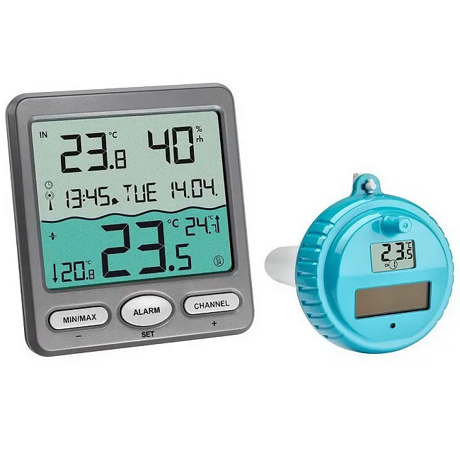 Виробник: TFA Dostmann GmbH & Co.KG, GermanyОсобливості:Пристрій призначений для басейну і штучного водоймищаТемпература води (глибина вимірювання до 180 мм) передається від бездротового зовнішнього датчика на частоті 433 МГц, відстань передачі до 50 метрів на відкритому просторіЗовнішній датчик з ЖК-дисплеєм і сонячною панеллюВстановлюваний сигнал граничних значень температуриКімнатна температура і вологістьФункція калібрування показань температури і вологостіМаксимальні і мінімальні значенняФункція автоматичного видалення максимальних і мінімальних значеньВеликий РК-дисплей (120 мм по діагоналі), що добре читаєтьсяРадіокерований годинник з високою точністю і можливістю ручного налаштуванняНалаштування часового поясу -12 / +12 годинБудильникКрім зовнішнього датчика температури води можливе підключення до 7 (семи) додаткових зовнішніх бездротових датчиків температури і вологості повітря (арт.30.3208.02) для контролю всередині приміщення (наприклад, дитячої кімнати, підвалу та ін.) або зовнішнього клімату. Датчики купуються окремоЗареєстрований дизайн TFAБасейн вже спокушає вас розслаблюючим купанням або бризками? За допомогою сучасного бездротового термометра «VENICE» ви завжди можете контролювати температуру води у вашому басейні чи ставку - і це не виходячи з вашої вітальні. Плаваючий термометр-датчик на сонячній батареї для басейну передає інформацію безпосередньо і по бездротовому зв'язку на станцію, а також має власний дисплей температури. Термометр має глибину вимірювання 180 мм. Це дає вам особливо надійні значення. В якості особливого конструктивного рішення нижня область дисплея, яка показує найвищу і найнижчу температуру води, виділяється бірюзовими хвилями. У верхній частині дисплей інформує вас про клімат в приміщенні, місці встановлення, а також про точний час з датою. За бажанням, ви можете підключити додатково ще до 7 (семи) датчиків температури та вологості повітря, які можна придбати додатково.