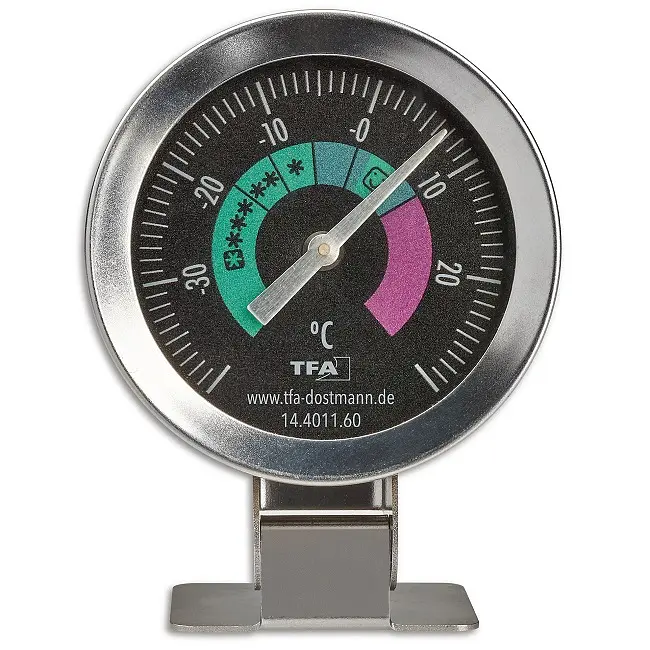 Виробник: TFA Dostmann GmbH & Co.KG, Germany Особливості: Для контролю температури в холодильнику чи морозильній камері. Температура вимірюється за допомогою перевіреної біметалічної технології. З гнучким тримачем і шкалою, що обертається. Виготовлений із високоякісної нержавіючої сталі. З індикацією зон заморожування. Настінний або окремо встановлений. З клейкою стрічкою. Зареєстрований дизайн TFA. Чи знаєте ви, що 7°C є ідеальною температурою в холодильнику? Більшість холодильників майже «переохолоджені» з налаштуваннями між 5-6°C. Проте правильна температура зберігає продукти в холодильній та морозильній камерах свіжими довше та заощаджує дорогоцінну енергію: усього лише збільшення на один градус може заощадити до 6% електроенергії. Однак ви не завжди можете покладатися на значення, які показує холодильник, якщо ваша модель має дисплей температури. Відхилення тут зазвичай є нормою, залежно від типу приладу, віку та виробника. Аналоговий термометр для холодильника показує, як ваша їжа веде себе в умовах температури. Ми розробили цей практичний кухонний домашній помічник та застосували його для вашого холодильника: його приємне поєднання кольорів пурпурового та зеленого показує, чи справді все в зеленому діапазоні температур. Термометр готовий до використання не тільки в холодильнику, але і в морозильній камері. Вимірює температуру від -40°C до +30°C. Смайлик показує ідеальний температурний діапазон для вашого холодильника. Зірки символізують відповідні значення для діапазону замерзання. Його незвичайний зовнішній вигляд виділяється серед багатьох інших термометрів. Але це не єдине, що примітно. Його матеріал із нержавіючої сталі та легке використання варті того, щоб придивитися до нього повторно: Просто розташуйте, повісьте або прикріпіть пристрій разом з його тримачем в центрі холодильника або морозильника на добре видимому місці та поверніть шкалу в потрібне положення. Якщо відображається правильний символ, ваш прилад налаштований оптимально. Завдяки загальному розміру близько 7 см цей пристрій не займає багато місця та його легко читати для швидкої перевірки температури. P.S. Ідеальна температура для вашої морозильної камери або морозильного відділення – як з точки зору енергоефективності, так і з точки зору охолодження продуктів – становить -18°C.