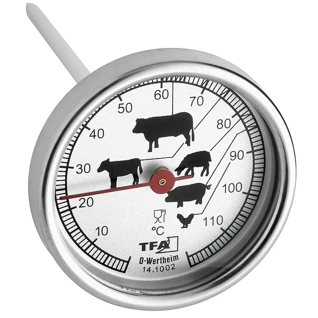 Виробник: TFA Dostmann GmbH & Co.KG, GermanyОсобливості:Для контролю внутрішньої температури м'ясаТемпература вимірюється за допомогою перевіреної біметалевої технологіїВиготовлений з високоякісної нержавіючої сталіІндикація зон ідеальної температури приготуванняДля духовки або гриляТермостійкі матеріалиІдеальний помічник на кухні для всіх любителів м'яса, барбекю і гурманів. Чи подобається вам рожевий стейк з яловичини, ніжна свиняча корейка або хрустка домашня птиця, цей термометр покаже вам ідеальну температуру приготування. Таким чином, ваше блюдо готується до досконалості. Щуп для проникнення з нержавіючої сталі з тонким наконечником просто вставляється в м'ясо, і тепер ви можете в будь-який момент бачити температуру всередині продукту. Цей практичний інструмент є термостійким і може залишатися в духовці або грилі протягом всього процесу приготування. Він також ідеально підходить для приготування при низькій температурі.