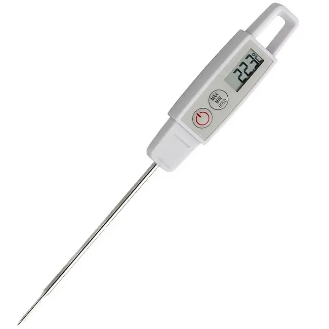 Виробник: TFA Dostmann GmbH & Co.KG, GermanyОсобливості:Вимірювання температури за допомогою щупа З довгим щупом (105 мм) Для простих вимірювань температури рідких, порошкоподібних і пластмасових виробів Висока точність: ± 0,5 °C при -10...+ 100 °C, в іншому випадку ± 1 °C Клас водонепроникності IP67 Висока швидкість вимірювання - близько 8 секунд Перемикач вмикання / вимикання Функція автоматичного відключення з функцією довгострокового вимірювання Функція утримання Функція Макс. / Мін. значень з динамічним оновленням Можливість калібрування Ідеально підходить для продуктів харчування, відповідно до HACCP і EN 13485 Пластиковий кейс з кліпсою для зберігання і транспортуванняБатарейка у комплектіЗареєстрований дизайн TFAМоніторинг температури всередині м'яса під час барбекю або смаження, перевірка безпечної температури дитячого харчування, приготування їжі в пекарні, кондитерських виробах або в сфері громадського харчування, управління прилавком - холодильником в м'ясній крамниці або в супермаркеті, перевірка складу або вхідний товарний огляд в їдальні, на кухні або в харчовій промисловості - все це можливі варіанти використання термометра з проникаючим щупом від TFA Dostmann. За допомогою цього зручного термометра можна швидко, точно і легко виміряти температуру страв. Просто занурте щуп в те, температуру чого необхідно виміряти, і протягом дуже короткого часу прилад видасть точні результати вимірювань. Цей водонепроникний термометр відповідає вимогам HACCP і EN 13485 і добре підходить для професійного використання в промисловості, роздрібній комерції, торгівлі та лабораторії.Відповідність європейському стандарту EN 13485Наші термометри сертифіковані відповідно до DIN EN 13485. Таким чином, продукція відповідає необхідним вимогам з точки зору типу вимірювання, точності вимірювання, допустимі межі та дозволу вимірювання для харчової промисловості.Відповідність європейському стандарту HACCPВимірювальні прилади можуть використовуватися без обмежень для вимірювань температури в контексті самостійного контролю в харчовій промисловості, завдяки своїй конструкції, використовуваним матеріалам, процедури вимірювання та точності вимірювання.