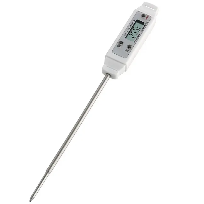 Виробник: TFA Dostmann GmbH & Co.KG, GermanyОсобливості:Вимірювання температури за допомогою щупаЗ довгим щупом (NTC) (125 мм)Для простих вимірювань температури рідких, порошкоподібних і пластмасових виробівВисока точність: ± 0,8 °C (0...+100 °C), ± 1 °C (-20...0 °C), в іншому ± 1,5 °CКлас водонепроникності IP65Висока швидкість вимірювання - усього за секундуПеремикач вмикання / вимиканняФункція автоматичного відключення через 5 хвилинФункція утриманняФункція Макс. / Мін. значеньІдеально підходить для продуктів харчування, відповідно до HACCP і EN 13485Пластиковий кейс для зберігання і транспортуванняБатарейка у комплектіЦей практичний термометр від TFA з довгим щупом-датчиком ідеально підходить для нескладного вимірювання температури їжі. Просто занурте щуп в те, температуру чого необхідно виміряти, і протягом дуже короткого часу прилад видає точні результати вимірювань. Моніторинг температури всередині м'яса під час барбекю або смаження, перевірка безпечної температури дитячого харчування, приготування їжі в пекарні, кондитерських виробах або в сфері громадського харчування, управління прилавком - холодильником в м'ясній крамниці або в супермаркеті, перевірка складу або вхідний товарний огляд в їдальні, на кухні або в харчовій промисловості - все це можливі варіанти використання «POCKET DIGITEMP». Термометр відповідає вимогам HACCP і EN 13485 і добре підходить для професійного використання в промисловості, роздрібній комерції, торгівлі та лабораторії. Він є водонепроникним і може бути очищений під струменем води після використання.Відповідність європейському стандарту EN 13485Наші термометри сертифіковані відповідно до DIN EN 13485. Таким чином, продукція відповідає необхідним вимогам з точки зору типу вимірювання, точності вимірювання, допустимі межі та дозволу вимірювання для харчової промисловості.Відповідність європейському стандарту HACCPВимірювальні прилади можуть використовуватися без обмежень для вимірювань температури в контексті самостійного контролю в харчовій промисловості, завдяки своїй конструкції, використовуваним матеріалам, процедури вимірювання та точності вимірювання.