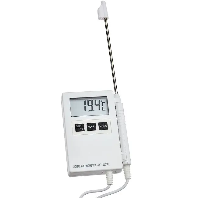 Виробник: TFA Dostmann GmbH & Co.KG, GermanyОсобливості:Вимірювання температури за допомогою щупа (NTC) з нержавіючої сталі довжиною 110 ммЗ проводом (60 см)Для вимірювання температури повітря, газу, рідин і пастоподібних речовинФункція утримання данихФункція Макс. / Мін. значеньТочність: ±1 °C (-25...+150 °C), в іншому ±1,5 °CКлас водонепроникності IP65Ідеально підходить для контролю температури продуктів харчування (відповідно до HACCP), торговців, промисловості, сільського господарства і хобіЗ кишеньковим затискачем і підставкоюБатарейки у комплектіЦифровий термометр з проникаючим щупом TFA "P200" ідеально підходить для професійного контролю температури рідких, пастоподібних і напівтвердих матеріалів. Він вимірює дуже точно і може використовуватися універсально. Термометр відповідає вимогам HACCP і ідеально підходить для професійного використання в промисловості, роздрібній комерції, торгівлі та лабораторії. Щуп з нержавіючої сталі з'єднаний з проводом довжиною 60 см. На додаток до поточної температурі відображаються найвищі і найнижчі показники, і пристрій має функцію утримання даних. Термометр повністю вологозахищений і може бути очищений під струменем води після використання. Дисплей можна закріпити за допомогою затискачів чи вбудованої підставки.Відповідність європейському стандарту HACCPВимірювальні прилади можуть використовуватися без обмежень для вимірювань температури в контексті самостійного контролю в харчовій промисловості, завдяки своїй конструкції, використовуваним матеріалам, процедури вимірювання та точності вимірювання