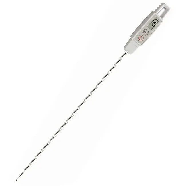 Виробник: TFA Dostmann GmbH & Co.KG, GermanyОсобливості:Вимірювання температури за допомогою щупаЗ наддовгим щупом (300 мм)Для простих вимірювань температури рідких, порошкоподібних і пластмасових виробівВисока точність: ± 0,5 °C при -10...+ 100 °C, в іншому випадку ± 1 °CКлас водонепроникності IP65Висока швидкість вимірювання - близько 8 секундПеремикач вмикання / вимиканняФункція автоматичного відключення з функцією довгострокового вимірюванняФункція утриманняФункція Макс. / Мін. значень з динамічним оновленнямМожливість калібруванняІдеально підходить для продуктів харчування, відповідно до HACCP і EN 13485Пластиковий кейс з кліпсою для зберігання і транспортуванняБатарейка у комплектіЗареєстрований дизайн TFAМоніторинг температури всередині м'яса під час барбекю або смаження, перевірка безпечної температури дитячого харчування, приготування їжі в пекарні, кондитерських виробах або в сфері громадського харчування, управління прилавком - холодильником в м'ясній крамниці або в супермаркеті, перевірка складу або товарний огляд в їдальні, на кухні або в харчовій промисловості - все це можливі варіанти використання термометра з проникаючим щупом від TFA Dostmann.За допомогою цього зручного термометра можна швидко, точно і легко виміряти температуру страв. Просто занурте щуп в те, температуру чого необхідно виміряти, і протягом дуже короткого часу прилад видасть точні результати вимірювань.Цей водонепроникний термометр відповідає вимогам HACCP і EN 13485 і добре підходить для професійного використання в промисловості, роздрібній комерції, торгівлі та лабораторії.Відповідність європейському стандарту EN 13485Наші термометри сертифіковані відповідно до DIN EN 13485. Таким чином, продукція відповідає необхідним вимогам з точки зору типу вимірювання, точності вимірювання, допустимі межі та дозволу вимірювання для харчової промисловості.Відповідність європейському стандарту HACCPВимірювальні прилади можуть використовуватися без обмежень для вимірювань температури в контексті самостійного контролю в харчовій промисловості, завдяки своїй конструкції, використовуваним матеріалам, процедури вимірювання та точності вимірювання