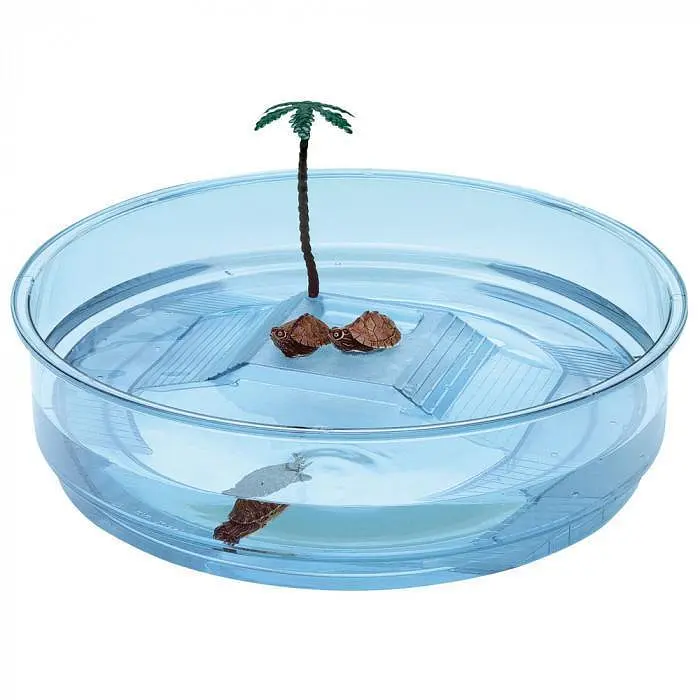 Oasi — кругла чаша для черепах із прозорого пластику, у комплекті з декоративним острівцем і пальмою. Діаметр чаші 30 см, вона підходить для комфортного розміщення дрібних рептилій; ідеальна для розміщення на невеликій площі. Пластиковий декоративний острівець можна легко прибрати на час прибирання. Якщо Ви обираєте чашу невеликого розміру, зверніть також увагу на овальну модель Arricot, також виготовлену з прозорого пластику.