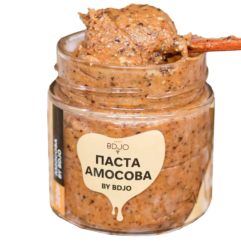 Ця паста - моя особиста “баночка турботи”. Створена за рецептом Миколи Амосова, вона поєднує в собі тільки найкраще: інжир, курагу, родзинки, журавлину, чорнослив, горішки, насіння чіа та кунжут, трохи кориці й лимонного соку. Ніякого цукру, консервантів чи "хімії" - тільки натуральна користь і смачнючий аромат.