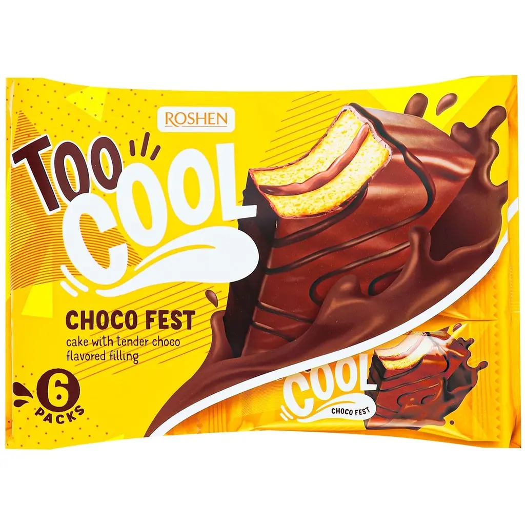 Тістечко Roshen Too Cool Choco Fest є втіленням кондитерської майстерності, об'єднуючи в собі легкість і пишність бісквіта з глибоким і насиченим шоколадним смаком. Цей десерт пропонує витончене задоволення для кожного, хто цінує вишуканий смак і якість. Він буде чудовим вибором для чаювання або кавової перерви, а також може стати приємним сюрпризом для близьких і друзів.