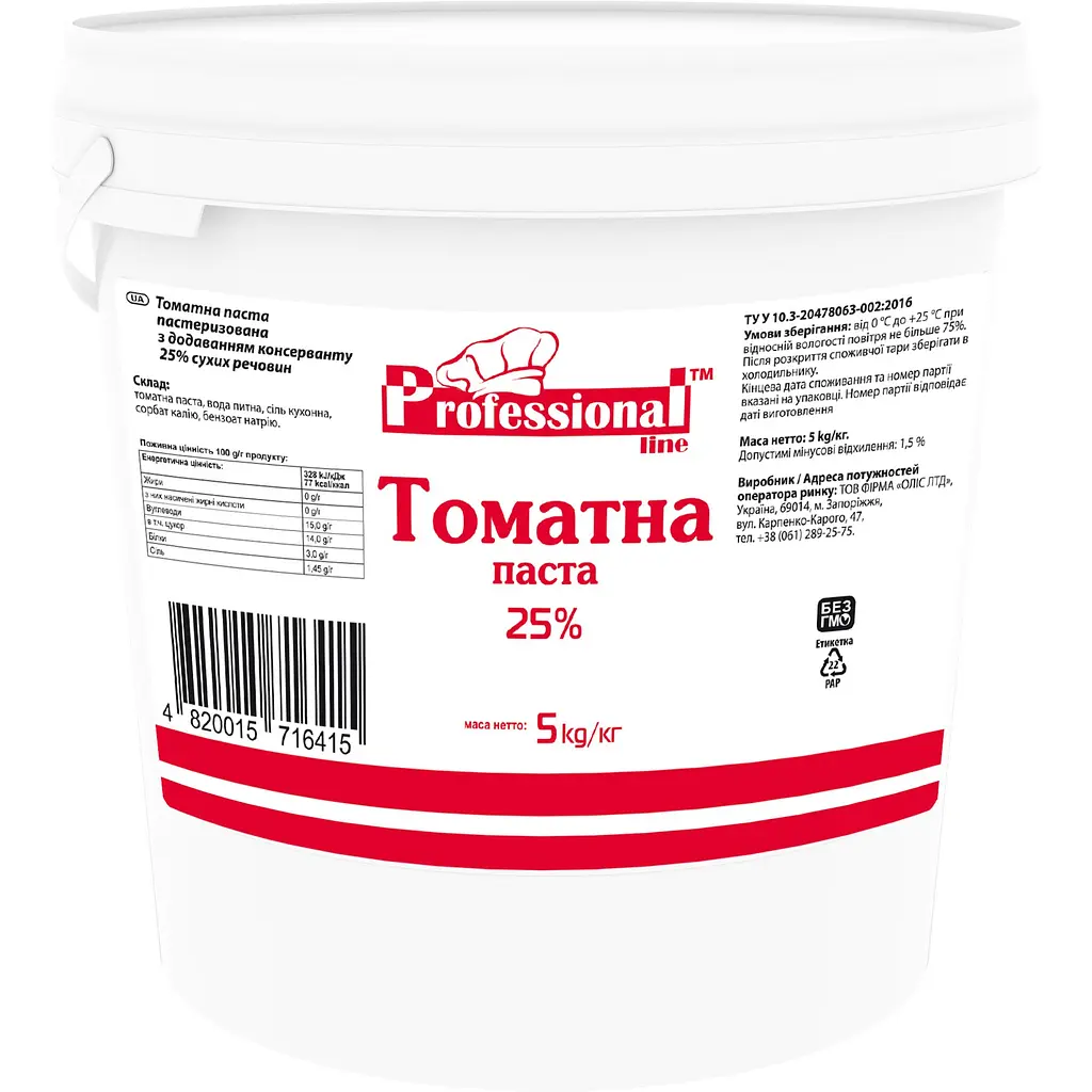 Томатна паста Professional Line - це високоякісна паста, яка виготовляється з відбірних томатів і має насичений смак з приємною кислинкою. Завдяки вмісту 25% томатної м’якоті, вона є ідеальною основою для соусів, супів, рагу, піци та багатьох інших страв, що потребують виразного томатного смаку.