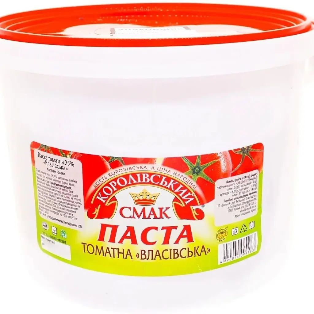Брала це відерце «Королівський смак», бо зараз сезон, і маленьких пачок просто не накупишся. Об'єм майже кілограм — якраз те, що треба на велику родину. Паста густа, колір насичений, смак натуральний томатний. Використовую і в борщ, і в підливу до голубців. Зберігається в холодильнику добре, не розшаровується. Гарний варіант, особливо за акційну ціну