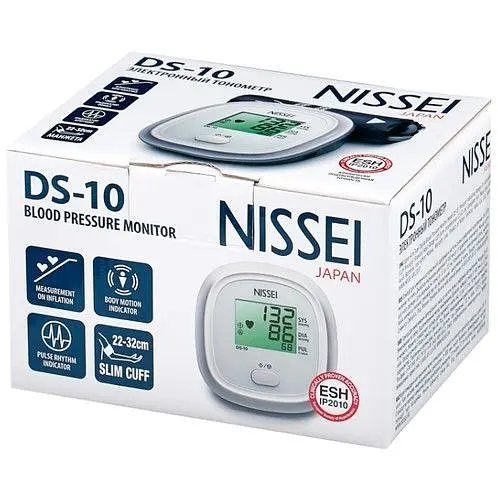 Автоматичний тонометр Nissei DS-10 - нова модель і технологія від японської торгової марки Nissei, надійність, якість і зручність у використанні - головні цілі при розробці даного тонометра. Головним завданням інженерів компанії було створити простий, точний, багатофункціональний прилад за невеликою ціною, з чим вони чудово впоралися. Вимірювання тиску відбувається під час нагнітання повітря в манжету - такий спосіб є одним з найточніших, знижуючи навантаження на судини і не перетискаючи їх під час вимірювань. Конусна міцна і зручна манжета, з м'якого приємного до тіла матеріалу, дозволяє під час процедури вимірювання тиску не відчувати дискомфорту. Наявність індикатора аритмії дає можливість контролювати серцевий ритм, вчасно випити лікарські препарати або звернутися до лікаря. Гарантія 5 років свідчить про якість приладу. Великий дисплей з великими символами дозволяє користуватися приладом людям з ослабленим зором. Тонометр Nissei DS-10 пройшов всі необхідні перевірки і був схвалений Європейським Товариством гіпертонії для використання в медичних установах, а також в домашніх умовах.