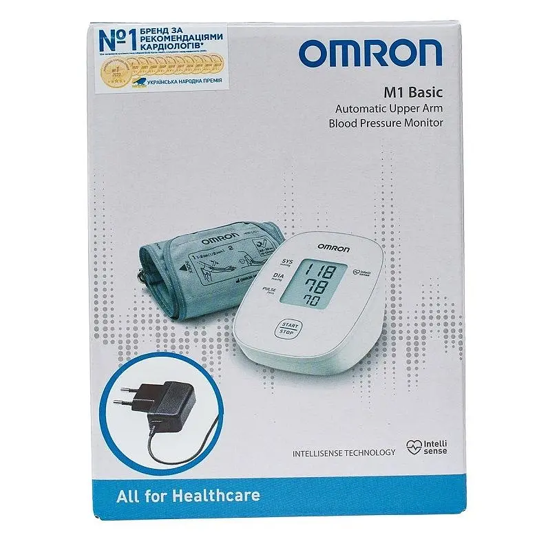 Комплектація: Електронний блок Omron M1 Basic (HEM-7121J-AF), мережевий адаптер Omron HHP-CM01, віялоподібна манжета (22-32 см), посібник з експлуатації, комплект елементів живлення, гарантійний талон.
