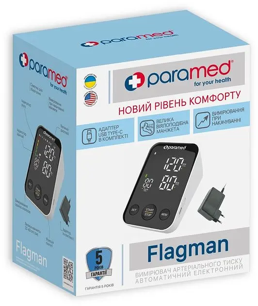 Тонометр Paramed Flagman з голосовим супроводом це пристрій для вимірювання тиску, оснащений додатковими функціями, які роблять процес простим і зручним, це автоматичний тонометр з роз'ємом Type-C і мережевим адаптером в комплекті.