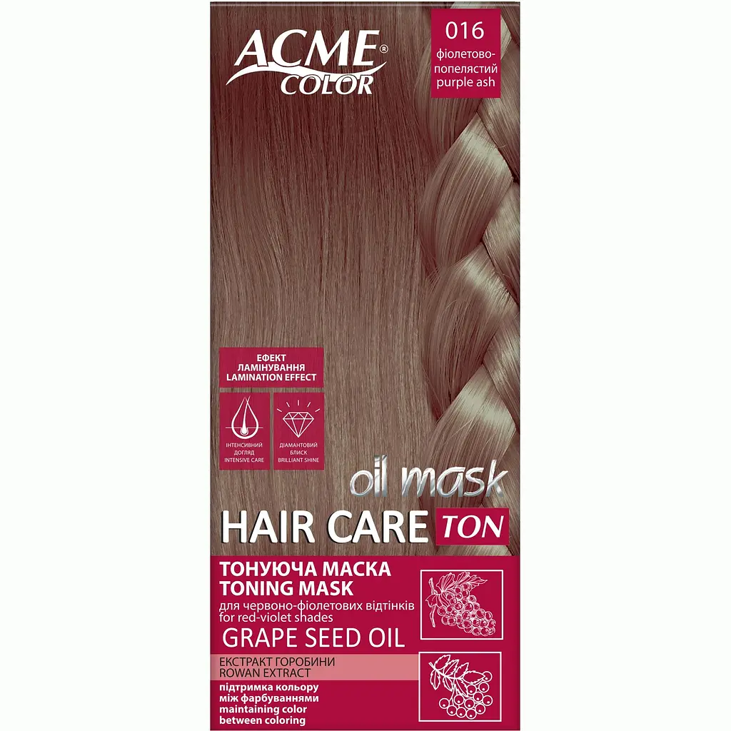 Тонуюча маска для волосся Acme Color Hair Care Ton oil mask має ефект ламінування, запобігає ламкості, сухості та пошкодженню волосся, захищає від впливу зовнішнього середовища.
