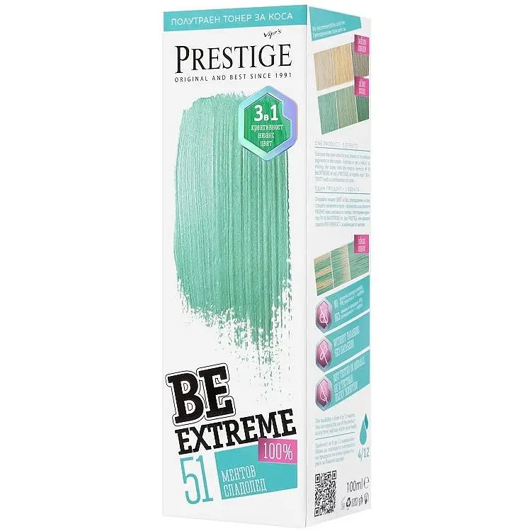 Фарбувальний засіб на основі спеціально розробленої щадної формули Vip's Prestige Be Extreme без аміаку дозволяє досягти максимально рівномірного та насиченого відтінку на заздалегідь освітлених пасмах. Палітра рясніє 12 унікальними й екстремальними відтінками, серед яких ви неодмінно підберете відповідний вашому настрою і задуманому образу. Отриманий колір протримається на локонах від 4 до 12 тижнів, залежно від стану волосся.