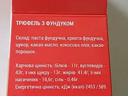 Паста фундучна, крихта фундучна, цукор, какао-масло, кокосова олія, какао-порошок.