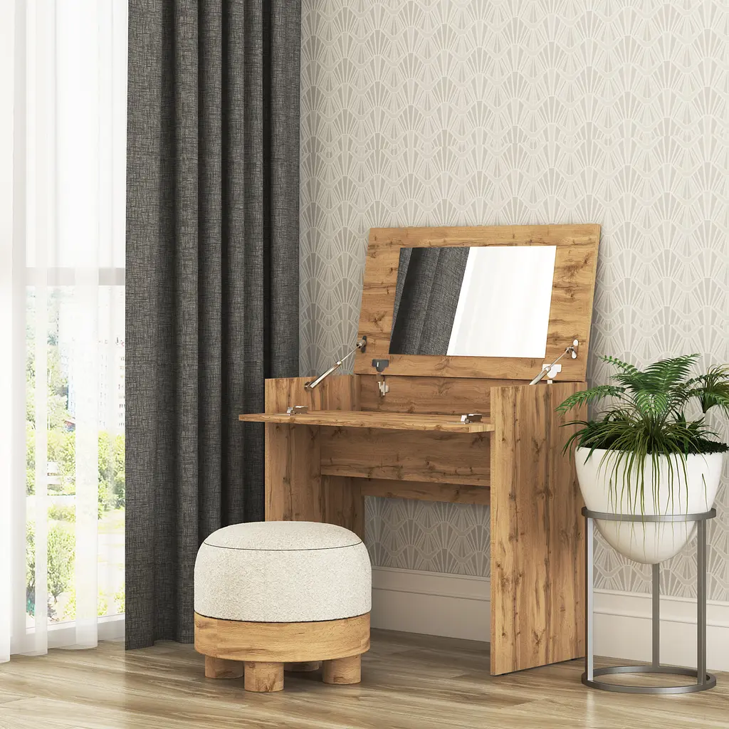 Трюмо з дзеркалом MebelStar Нео – стильний косметичний столик для вашої спальні Трюмо з дзеркалом MebelStar Нео – зручне рішення для нанесення макіяжу та догляду за собою. Завдяки відкидній кришці з дзеркалом, цей туалетний столик поєднує в собі функціональність та елегантний сучасний дизайн. Модель має компактні розміри, що дозволяє легко розмістити її у будь-якій кімнаті. Стільниця, що відкидається, відкриває простору нішу для зберігання косметики, аксесуарів, прикрас та інших необхідних речей. Макіяжний столик створений для вашого комфорту – він допоможе організувати всі засоби догляду в одному місці. Ідеально підходить для ранкових ритуалів макіяжу або вечірнього догляду за обличчям. Розміри: Ширина (см): 80 Глибина (см): 43 Висота (см): 75,2 Цей туалетний столик у спальню підходить для тих, хто цінує зручність та функціональність. Він може виконувати роль як столика для макіяжу, так і місця для зберігання косметичних засобів. Завдяки універсальному дизайну, трюмо ідеально поєднується з іншими меблями у вашій кімнаті. Зверніть увагу! Відтінок виробу на фотографії може відрізнятися від реального через особливості передачі кольорів монітором, налаштування фотообладнання та інші технічні фактори.