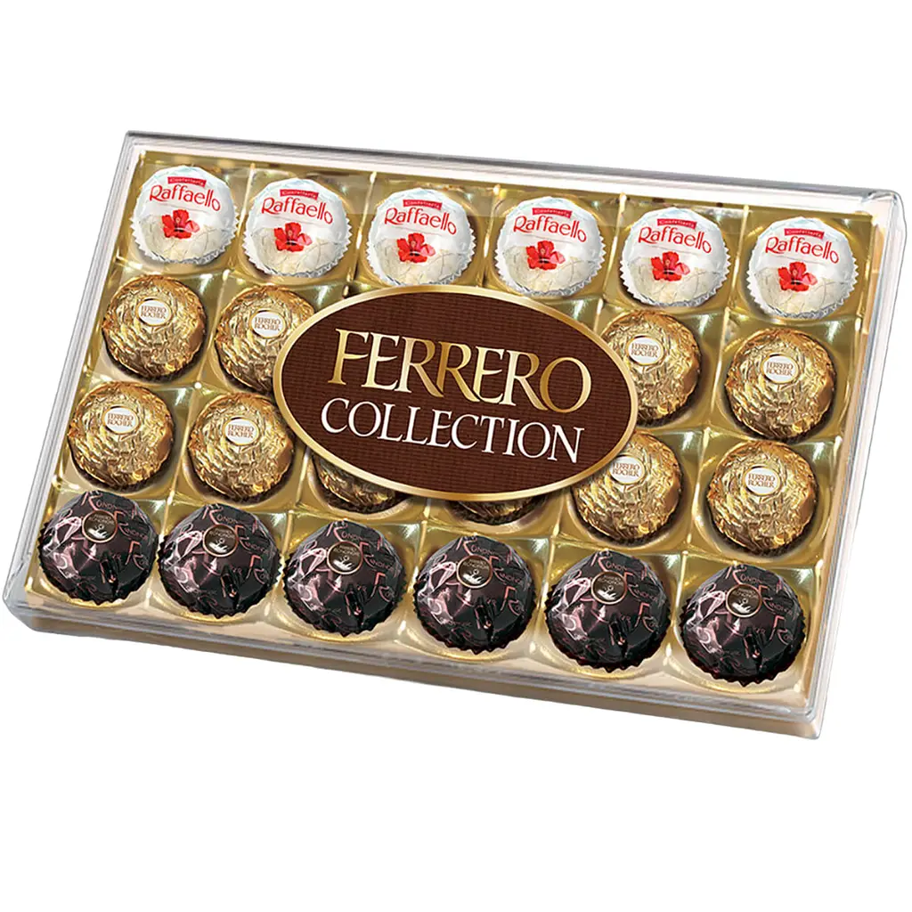 Колекція трьох довершених смаків Ferrero: поєднання лісового горіха та молочного шоколаду в Ferrero Rocher, вишуканий рецепт темного шоколаду в Ferrero Rondnoir та ніжний смак кокосу в Raffaello.