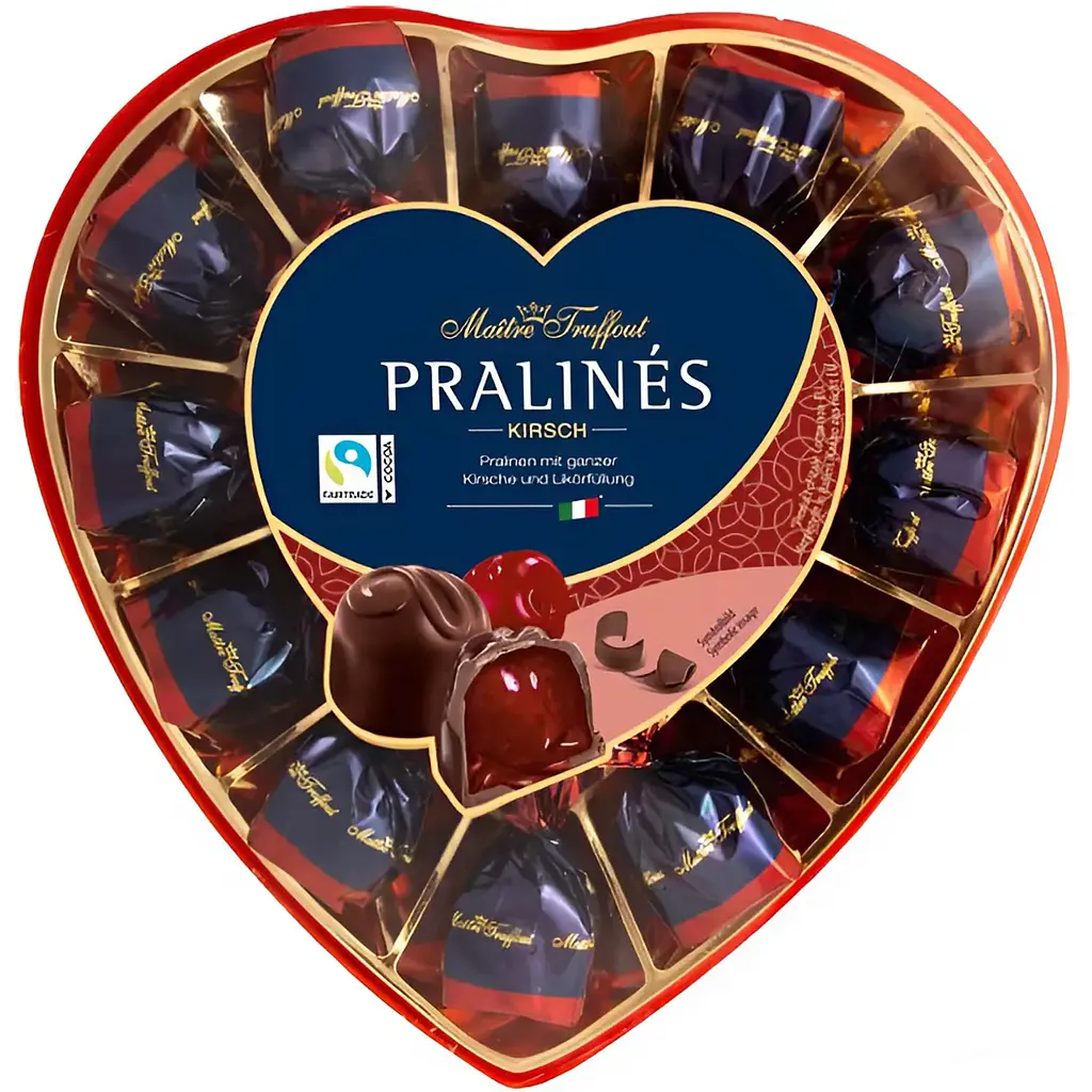Чорний шоколад від Maitre Truffout з цілою вишнею та лікерною начинкою. У красивій подарунковій упаковці у формі серця.