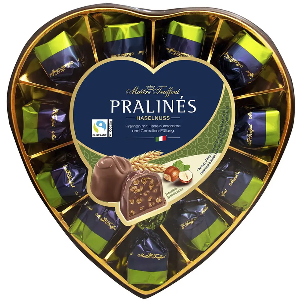 Цукерки Maitre Truffout Праліне молочний шоколад з лісовими горіхами та злаками - це вишуканий набір цукерок, які поєднують ніжний молочний шоколад з хрусткою начинкою з лісових горіхів та злаків. Ці цукерки мають м'яку та кремову текстуру, що гармонійно поєднується з хрусткими елементами, надаючи їм неповторний смак.