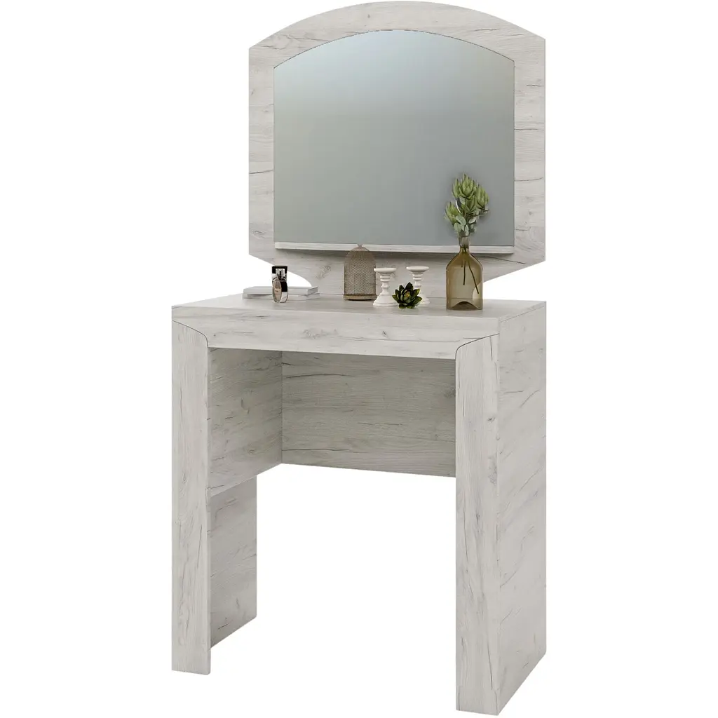 Виконаний у стильному мінімалістичному дизайні, що дозволяє розмістити його у спальні з будь-яким інтер'єром. Практична конструкція складається з оригінального столика та прямокутного дзеркала, закругленого вгорі. Оптимальні розміри не займають багато місця, додатково до столика можна підібрати невелику тумбу та пуф із цієї ж серії, створивши єдину композицію.