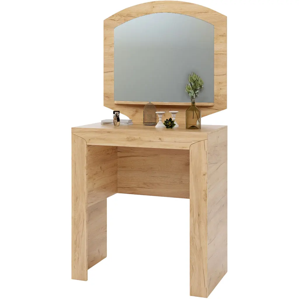 Виконаний у стильному мінімалістичному дизайні, що дозволяє розмістити його у спальні з будь-яким інтер'єром. Практична конструкція складається з оригінального столика та прямокутного дзеркала, закругленого вгорі. Оптимальні розміри не займають багато місця, додатково до столика можна підібрати невелику тумбу та пуф із цієї ж серії, створивши єдину композицію.