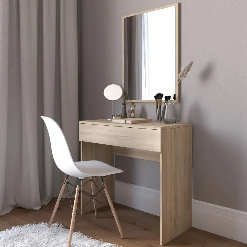 Туалетний столик VAYS D-3 - елегантне та компактне рішення для спальні або гардеробної з функціональною висувною шухлядою. Ідеально підходить для зберігання косметики, парфумів, прикрас та інших дрібниць. Завдяки розмірам 80×40×76 см, модель не займає багато місця, але забезпечує зручну робочу поверхню для макіяжу та догляду за собою.