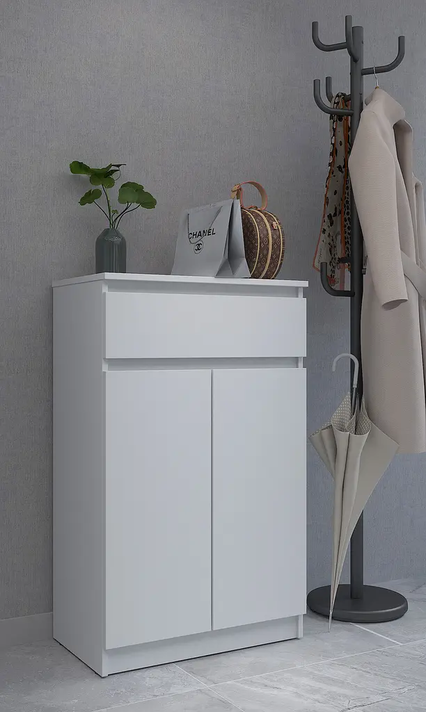 Тумба для взуття MebelStar "Нео" для передпокою Тумба для взуття MebelStar "Нео" у кольорі Аляска білий — практичне рішення для зберігання взуття у передпокої. Модель поєднує в собі функціональність та сучасний дизайн, забезпечуючи порядок та чистоту у вашому будинку.Тумба для взуття виконана з якісного ДСП, яке є ідеальним матеріалом для меблів, завдяки своїй міцності та довговічності. Тумба оснащена просторою скринькою у верхній частині телескопічних напрямних повного висування для зберігання ключів, дрібних аксесуарів або інших необхідних предметів. Два зручні відсіки з полицями за дверцятами забезпечують достатньо місця для взуття, допомагаючи зберегти порядок у передпокої. Розміри: Ширина (см): 80 Глибина (см): 35 Висота (см): 95 Тумба для взуття в передпокій не тільки зручна, але й чудово впишеться в інтер'єр вашого передпокою, забезпечуючи стильне та акуратне місце для зберігання взуття. Ідеальна для тих, хто шукає полку для взуття в передпокій із закритими відсіками, щоб приховати взуття від сторонніх поглядів.Зверніть увагу! Відтінок виробу на фотографії може відрізнятися від реального через особливості передачі кольорів монітором, налаштування фотообладнання та інші технічні фактори.