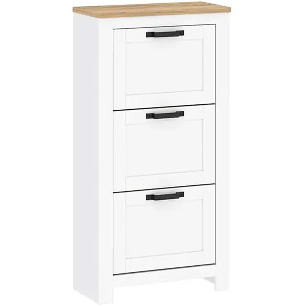 Фасади тумби для взуття виконані з пагонажного профілю МДФ товщиною 19 мм і покриті матовою плівкою ПВХ, створюючи стильний вигляд. Пластикові ручки чорного кольору додають тумбі елегантності та зручності. Ця тумба - це організація та стиль в одному вигляді.