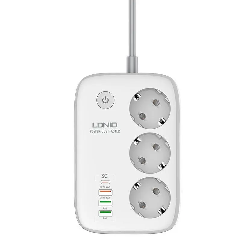 До кінця акції 161 деньРозумний мережевий подовжувач LDNIO SEW3452 – це високотехнологічний пристрій від LDNIO із Wi-Fi керуванням, призначений для живлення та зарядки кількох пристроїв. Оснащений 3 універсальними розетками EU та 4 портами: 3 USB-A (один із QC 3.0, 18W) і 1 Type-C (PD 3.0, 30W). Загальна потужність портів – 38W, розеток – 2500 Вт (250В, 10A). Довжина кабелю – 2 м, переріз 3х0.75 мм, із мідними жилами. Корпус із вогнетривкого пластику витримує температуру до 750°C, контакти з бронзи забезпечують зносостійкість. Wi-Fi керування через додаток (наприклад, Smart Life) дозволяє дистанційно вмикати/вимикати розетки, налаштовувати таймери та сценарії. Підтримує голосове керування (Amazon Alexa, Google Assistant). Захищає від перевантажень, короткого замикання та перепадів напруги. Колір – білий.