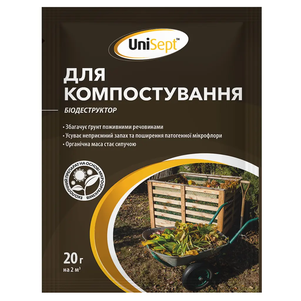 Біодеструктор для компостування UniSept - надійний засіб для отримання високоякісного компосту, який прискорює процес розкладання органічних відходів, забезпечуючи збагачення ґрунту корисними речовинами для вашого саду чи городу.