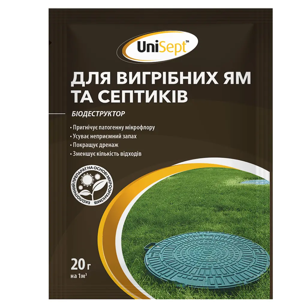 Біодеструктор для вигрібних ям та септиків UniSept - ефективний засіб для екологічного очищення вигрібних ям та септиків, що допомагає швидко й ефективно розкладати органічні відходи та нейтралізувати неприємні запахи.