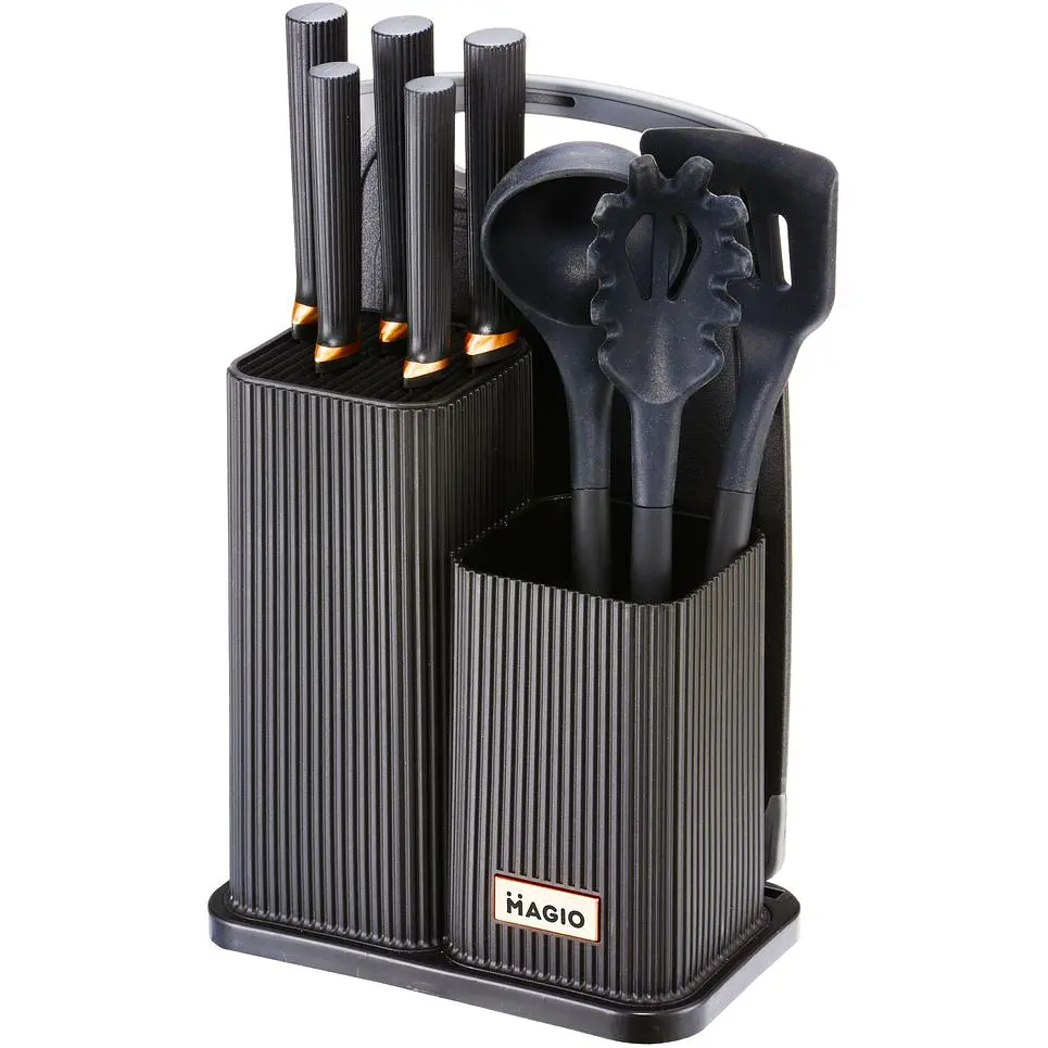 Кухонний набір MG-1099 - незамінний надійний помічник на вашій кухні. В цей набір входить 5 ножів, обробна дошка, кухонне приладдя на підставці. Набір ножів виготовлений з високоякісної нержавіючої сталі, ручка не ковзає приємна на дотик.