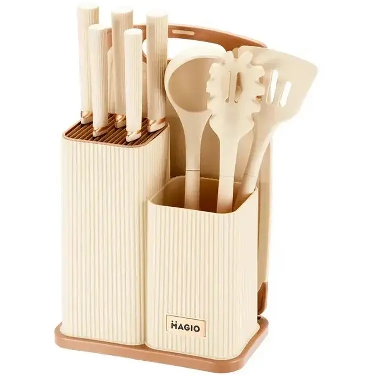 Кухонний набір MG-1099 - незамінний надійний помічник на вашій кухні. В цей набір входить 5 ножів, обробна дошка, кухонне приладдя на підставці. Набір ножів виготовлений з високоякісної нержавіючої сталі, ручка не ковзає приємна на дотик.