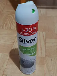Універсальний водовідштовхувальний аерозоль Silver розроблений для складних погодних умов. Спеціальна формула для використання в суворих зимових умовах. Підходить для всіх типів шкіри, замші, нубуку, велюру та тканини. Захищає від води, дощу, снігу та появи масляних плям. Надійно захищає від вологи та бруду на весь день, зберігаючи "дихаючі" властивості взуттєвих матеріалів.