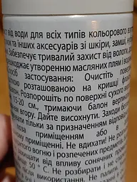 Це стандартний, робочий водовідштовхувальний спрей. Він добре захищає від невеликого дощу та бруду, але не чекайте дива під час сильної зливи. Він має різкий запах при нанесенні, тому обов'язково користуйтеся ним на балконі або на вулиці. Свою ціну виправдовує, але потрібен час для повного висихання.