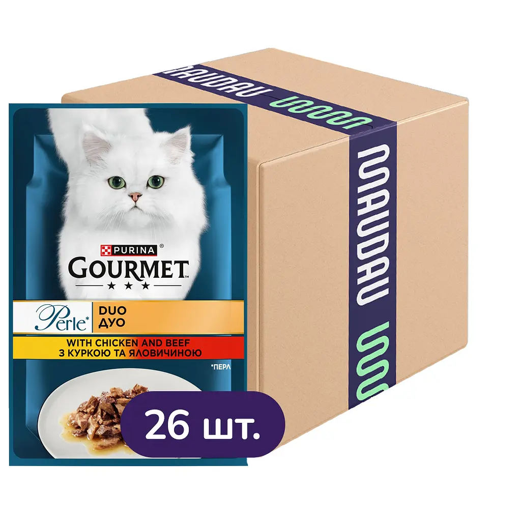 Вологий корм Gourmet Perle Duo з яловичиною та куркою у підливці - це вишукане та збалансоване харчування для вашої кішки, створене з урахуванням її смакових уподобань.