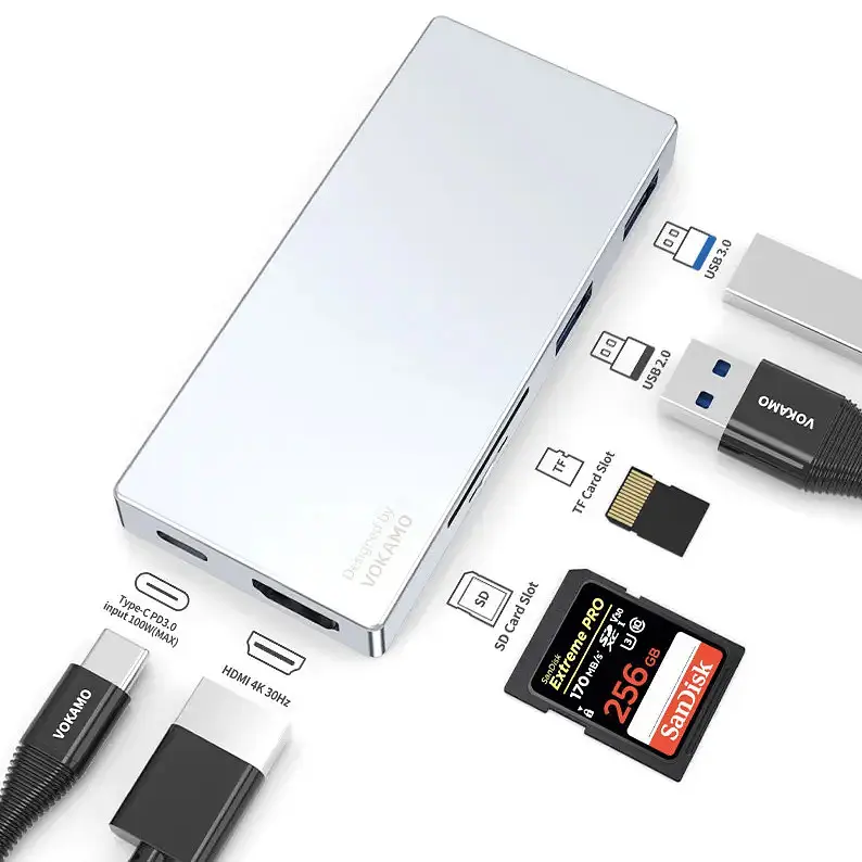USB адаптер Vokamo HT2 має всі можливі роз'єми, які необхідні при щоденній роботі - Type-C для зарядки (PD 3.0 - 100W), USB 3.0, USB 2.0, HDMI, і кардрідер TF, SD.