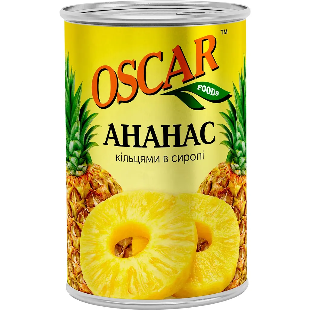 Ананаси кільцями Оscar – дивовижні ласощі, що відрізняються тонким ароматом і ніжним смаком. Встигаючи в теплих променях лагідного сонця відрізняються не тільки своїм ідеальним виглядом і смаком, але й корисними властивостями, які примножуються внаслідок чистого району зростання. Ароматна консервація ідеальна для вживання в чистому вигляді або включення до складу випічки та інших десертів.