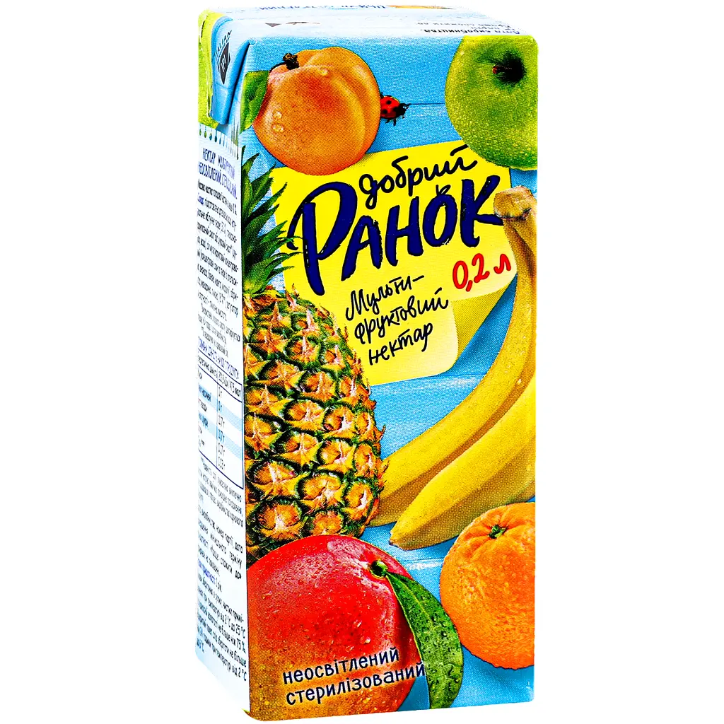 Нектар Добрий Ранок мультифруктовий - насичений напій, який виготовляється з українських фруктів та овочів. Завдяки відмінній якості напої торгової марки Добрий Ранок є пріоритетним вибором для багатьох споживачів. Напій від торгової марки Добрий Ранок виробляється з високоякісних інгредієнтів за ультрасучасною технологією, що гарантує його високу якість і абсолютну екологічність.