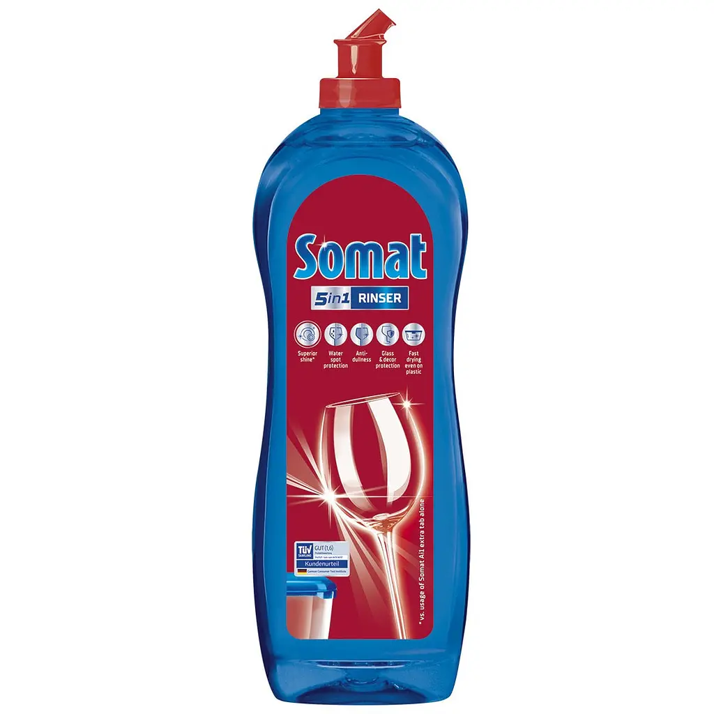 Ополіскувач Somat з ефектом швидкого висихання надає блиску Вашому посуду без розводів та попереджає утворенню вапняного нальоту. Ополіскувач пом'якшує воду, внаслідок чого вода рівномірно стікає з посуду, не залишаючи при цьому розводів.