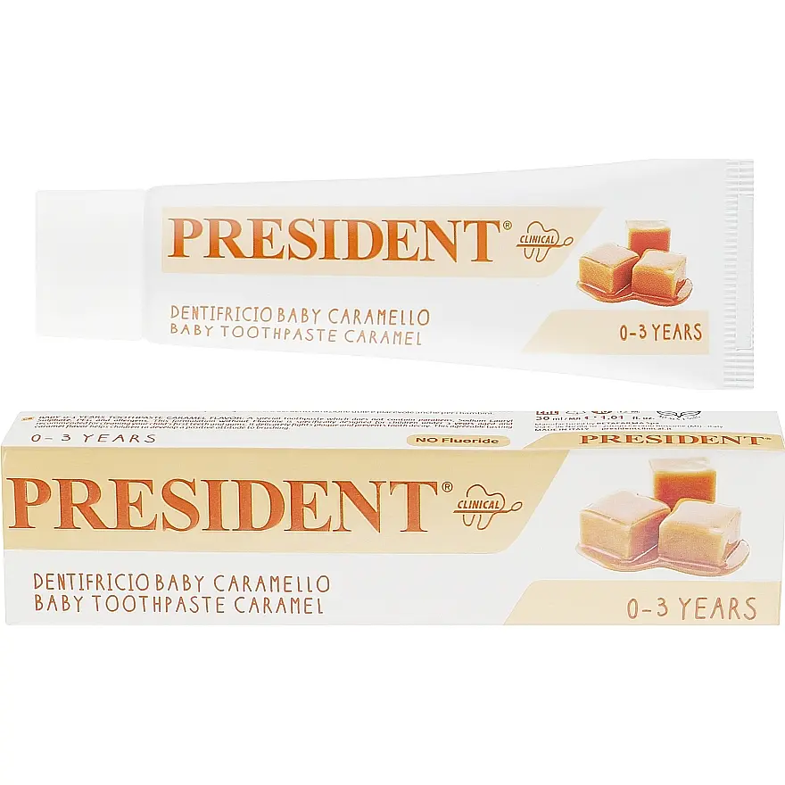 Зубна паста President Baby Toothpaste Caramel - спеціальна зубна паста, яка не містить парабенів, PEG та алергенів. Формула без фтору, спеціально розроблена для дітей до 3 років і рекомендована для чищення перших зубів і ясен вашої дитини. Вона делікатно бореться з нальотом і запобігає карієсу.