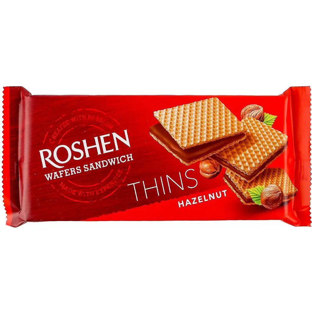 Вафлі Roshen Wafers Sandwich Thins Hazelnut - хрусткий кондитерський виріб зі смаком фундука.