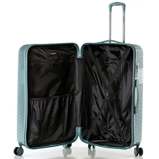 - Валіза має текстильну перегородку на блискавці, яка поділяє внутрішній простір на два основні відділення, перегородка має сітчасту кишеню на блискавці і дві відкриті кишені.