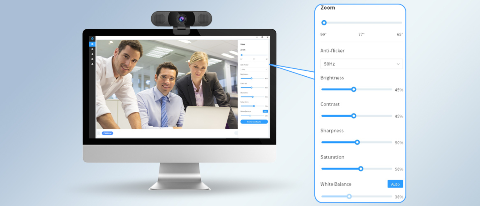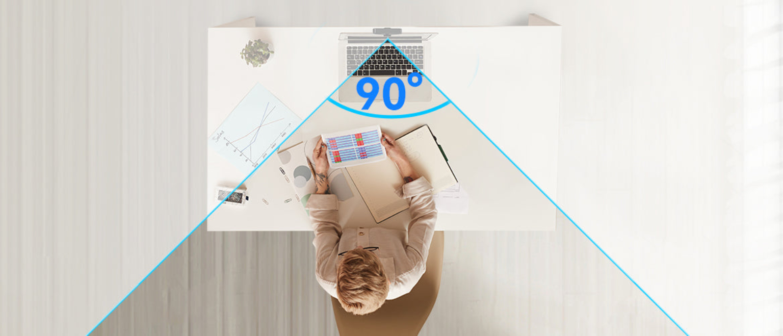eMeet з широким кутом огляду охоплює більше простору, тому не треба турбуватися про те, чи всі учасники потраплять у кадр – камера забезпечить комфортну та універсальну перспективу.