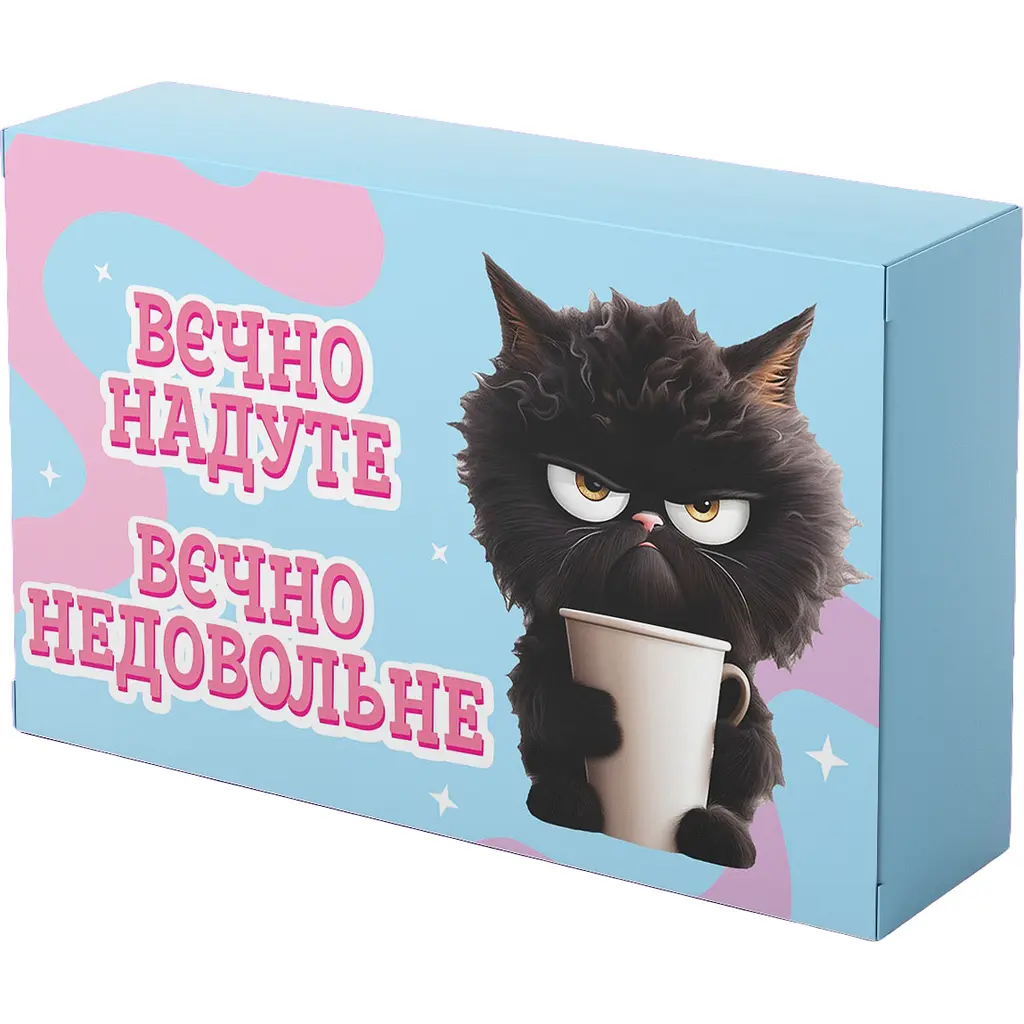 Ця порція «солодкого антидоту» вагою 50 г допомагає миттєво розрядити напружену атмосферу та перетворити невдоволення на посмішку. Напис на коробці «Вєчно надуте вєчно недовольне» – це водночас і жарт, і дієвий спосіб психологічного розвантаження, що нагадує: навіть найбільш похмурий настрій можна виправити шматочком якісного шоколаду. Плитка виготовлена з добірних інгредієнтів, які сприяють виробленню ендорфінів, допомагаючи «надутому» котику всередині кожного з нас нарешті подобрішати.