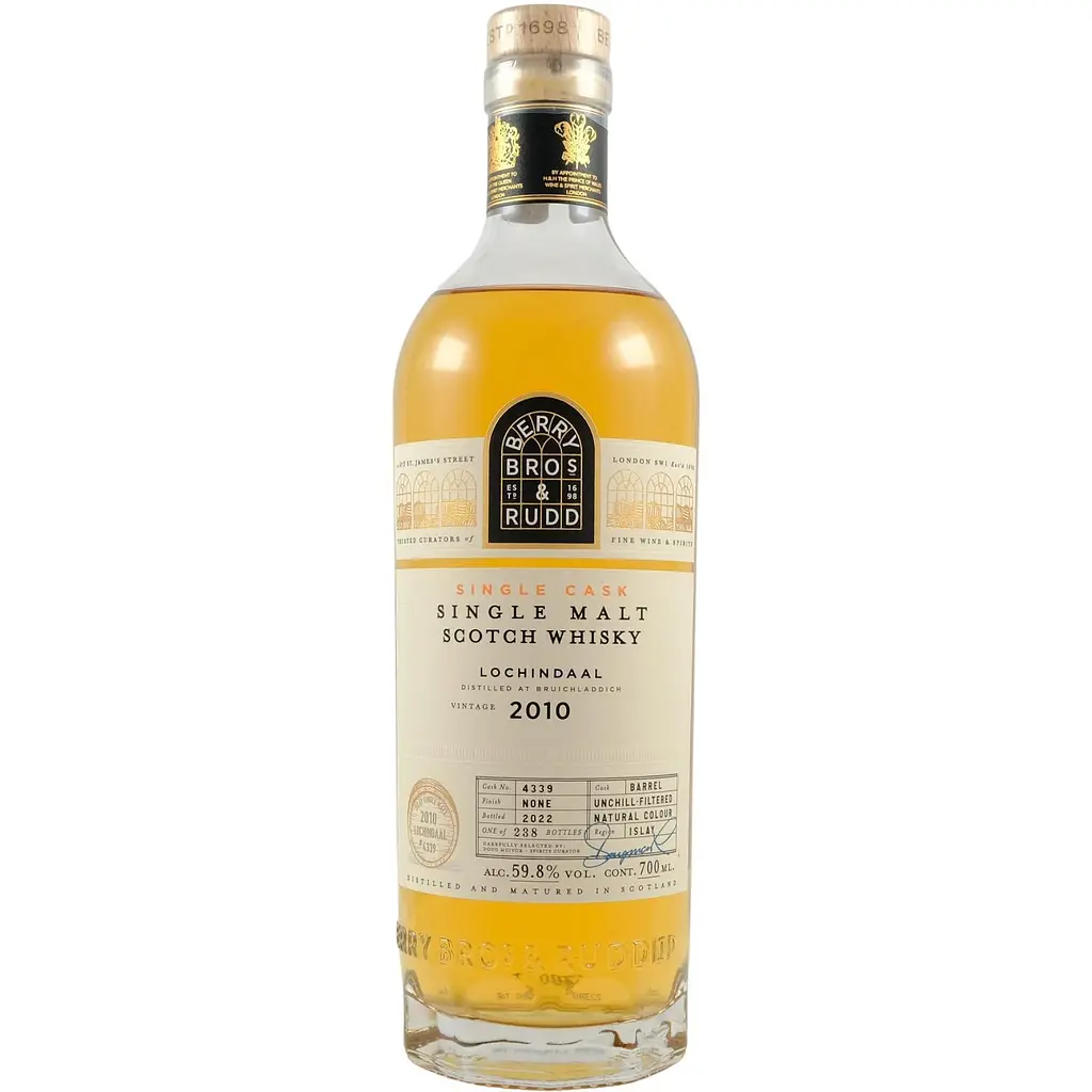 Віскі Berry Bros. & Rudd Lochindaal 2010 - рідкісний зразок односолодового віскі Lochindaal від Bruichladdich. Віскікурня на острові Айла виробляє віскі з різним ступенем торф'янистості й має різні назви для кожного з них - Lochindaal більш торф'яний, ніж Port Charlotte, але не такий торф'яний, як Octomore. Ось цей віскі - інді-розливу від Berry Bros. & Rudd, який був дистильований у 2010 році й розлитий по пляшках із міцністю бочки через 10 років. Було випущено 225 пляшок.