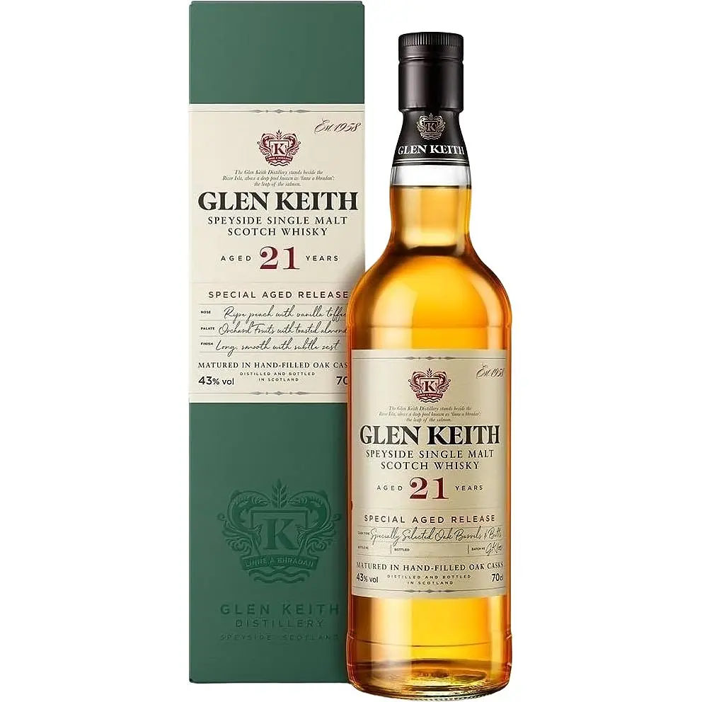 Віскі Glen Keith - горіховий, фруктовий односолодовий напій із Secret Speyside, витриманий у спеціально відібраних бочках та бочках протягом 21 року.